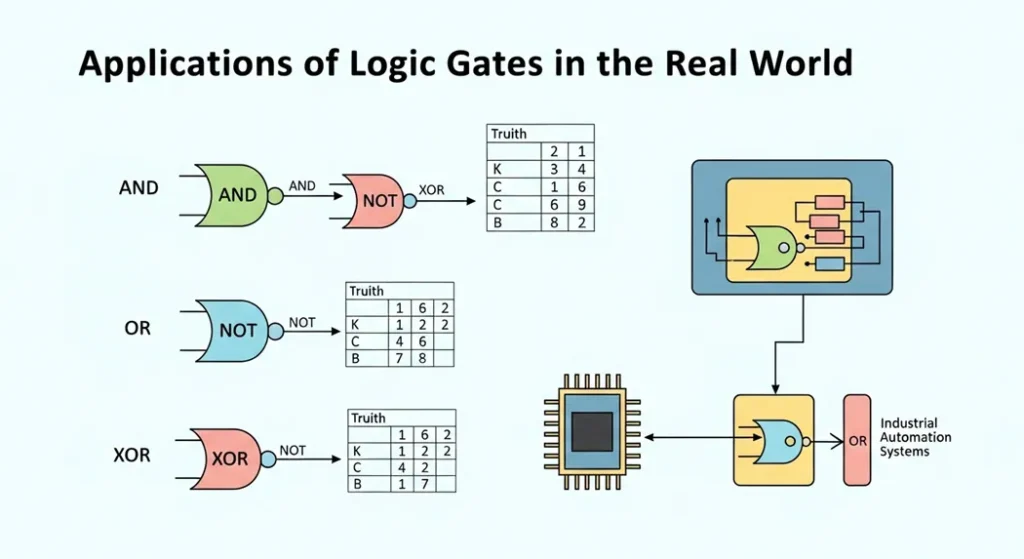 Logic gates are everywhere, powering the devices we use daily. Their behavior, defined by truth tables, determines how they’re applied. In computers, they form the backbone of CPUs, which contain billions of gates. For example, arithmetic operations like addition rely on circuits called adders, made from XOR and AND gates. Memory storage uses flip-flops, built from NAND or NOR gates, to store bits. Every click or keystroke on your laptop goes through logic gates to process the input.