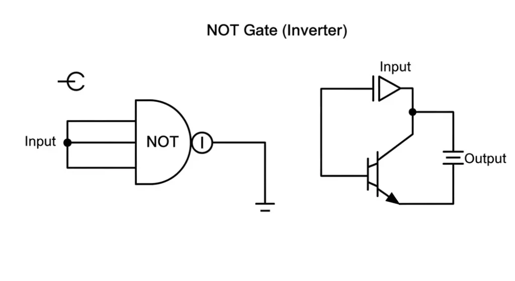 The NOT gate is the rebel it takes one input and flips it. If you give it a 1, it outputs a 0; give it a 0, it outputs a 1. It’s like a light switch that’s normally on but turns off when you press it. The symbol is a triangle with a small circle, called a bubble, at the output to show inversion. Mathematically, it’s written as Ā or A’, meaning “not A.”