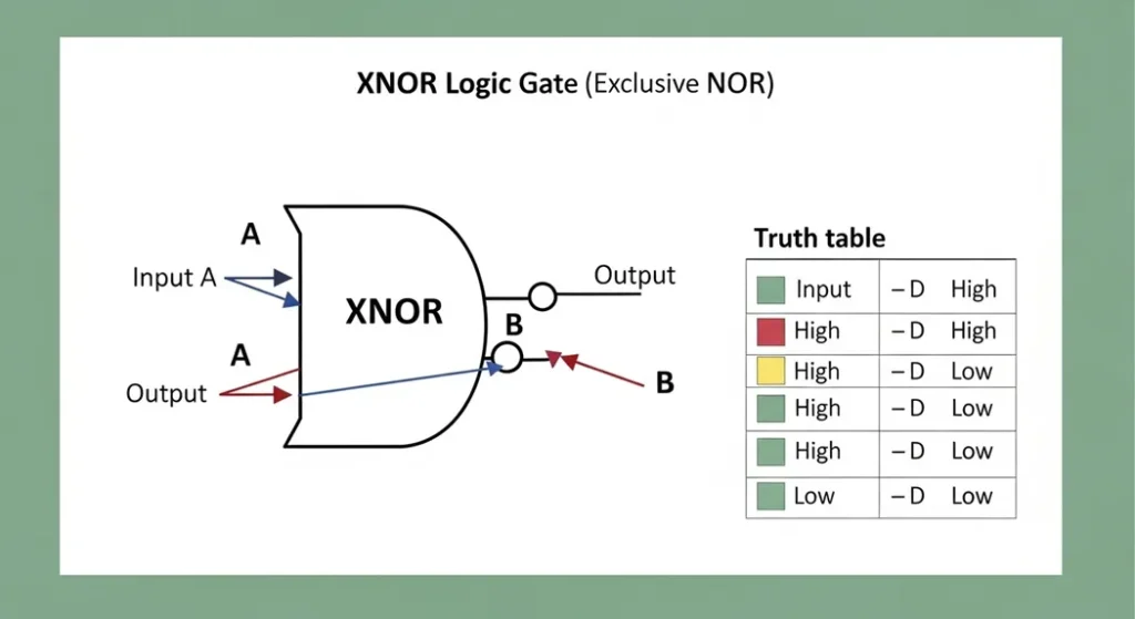 The XNOR gate, or Exclusive NOR, is the opposite of XOR. It outputs a 1 when inputs are the same, 0 when different. Imagine a system that checks if two signals match, like a password verifier. The symbol is an XOR gate with a bubble at the output. The Boolean expression is (A ⊕ B)’, or A’B’ + AB, meaning both inputs are the same.