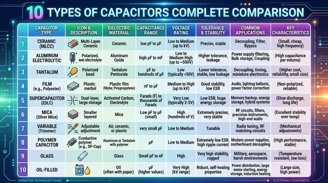 - ✅ The 10 main types differ by dielectric material: ceramic, electrolytic, tantalum, film, mica, supercapacitor, and more
