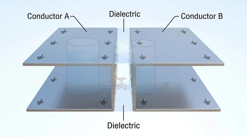 The dielectric is not just an insulator it actively increases capacitance. When the electric field is applied, the dielectric material becomes polarized: its molecules align with the field, effectively reducing the field strength and allowing more charge to accumulate on the plates for the same voltage. This effect is captured by the dielectric constant (relative permittivity, εᵣ):